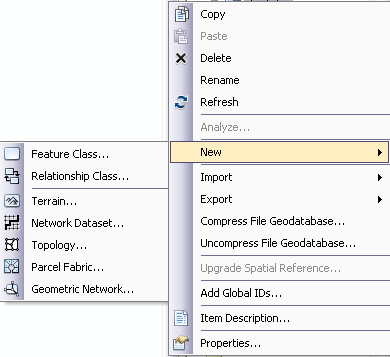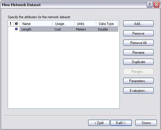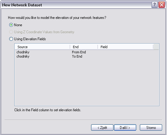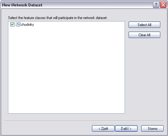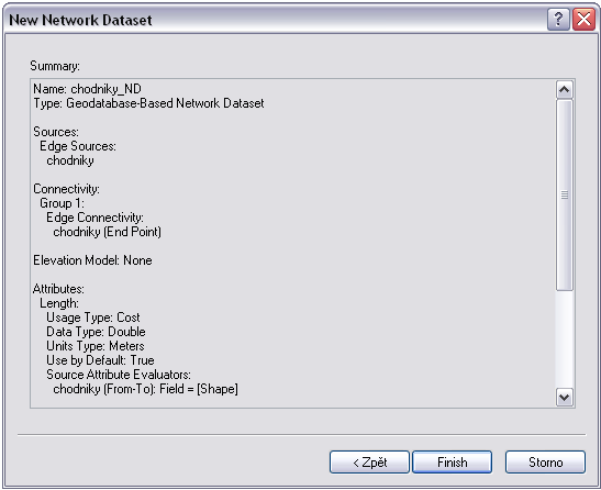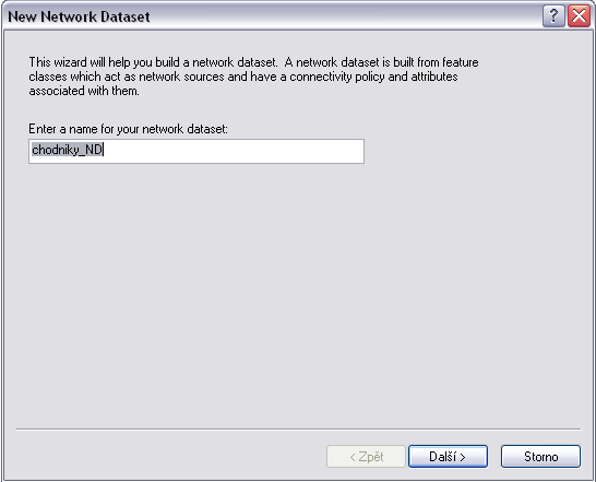 Základem je ždy liniová vrstva, která musí byt uložena v geodatabázi v příslušném datasetu. Teprve pak je možné Network Dataset vytvořit, což se provádí pravým tlačítkem na příslušný dataset a zvolením možnosti New - Network Dataset.Síť pěších komunikací