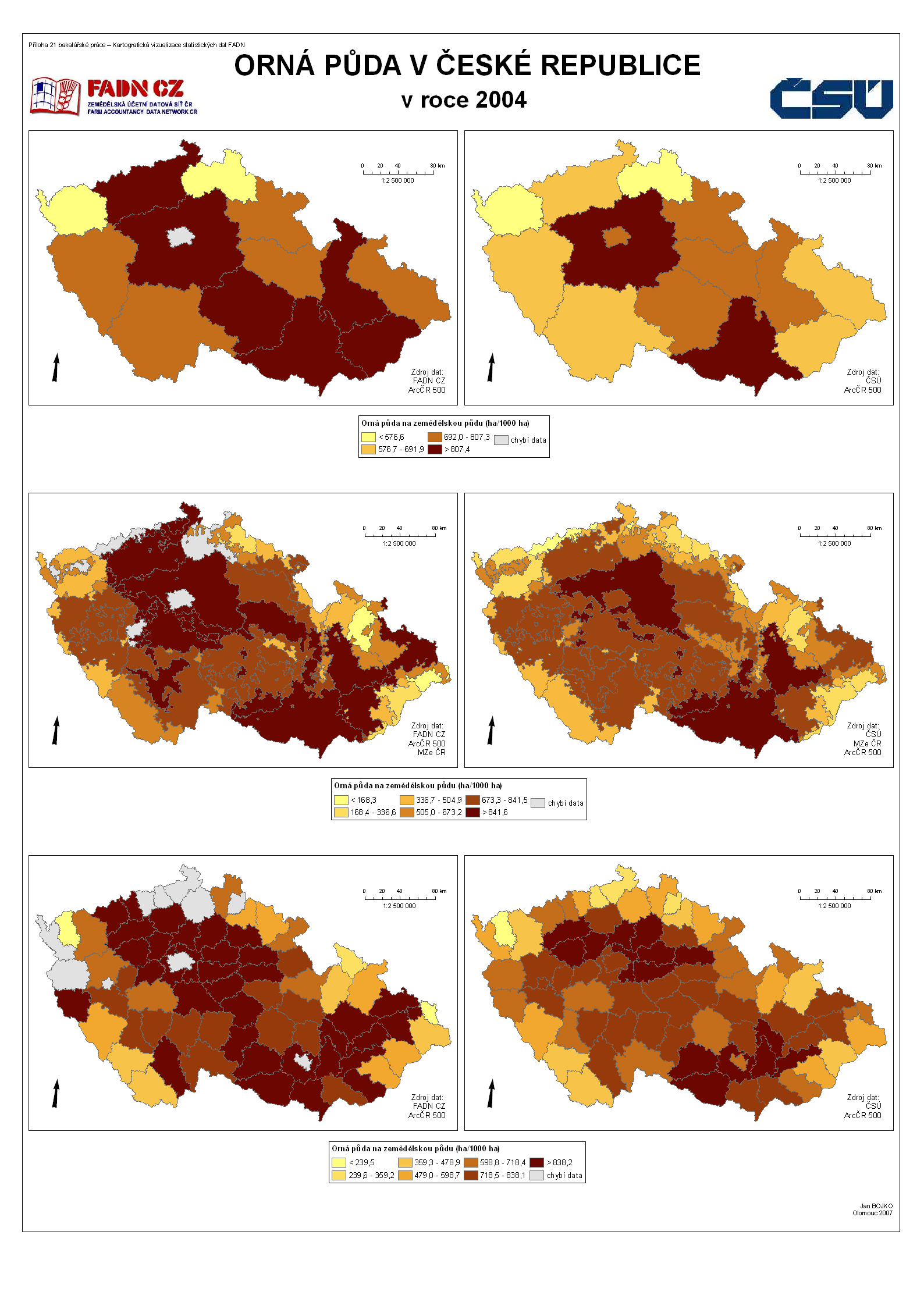 Vizuální i analytické porovnání půdního fondu databáze FADN CZ a ČSÚ. Ukázkový srovnávací mapový list zde.