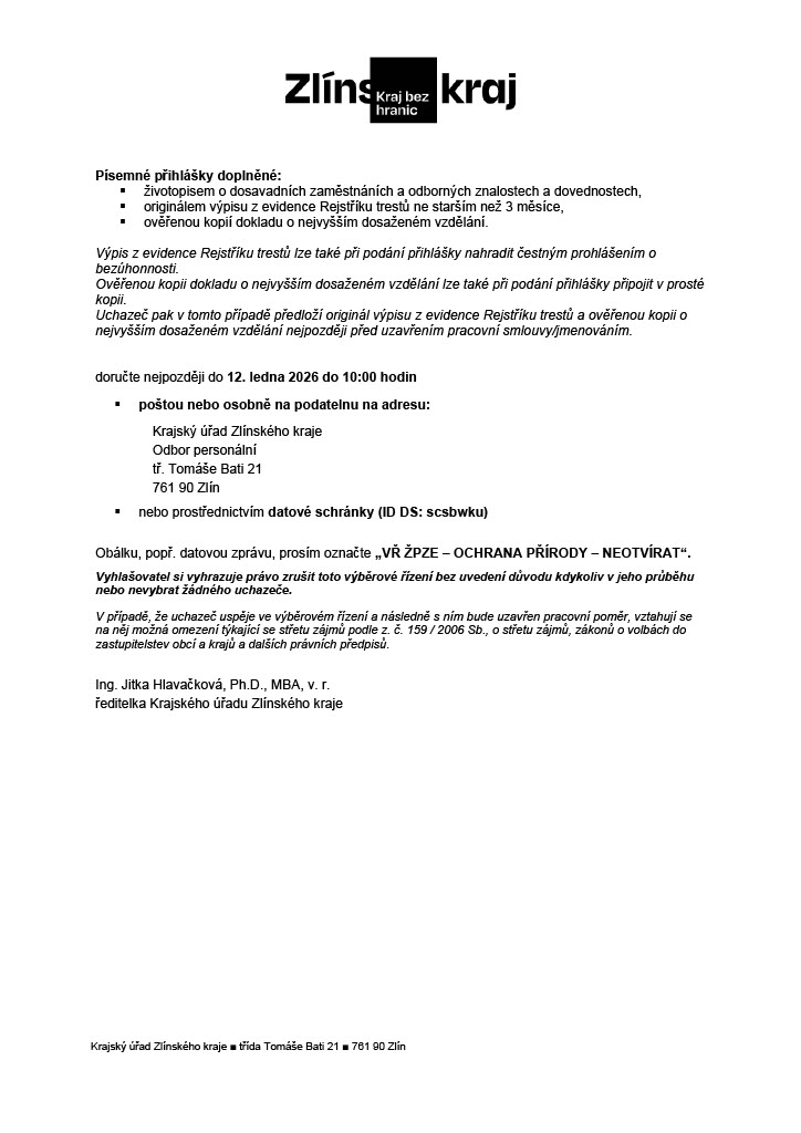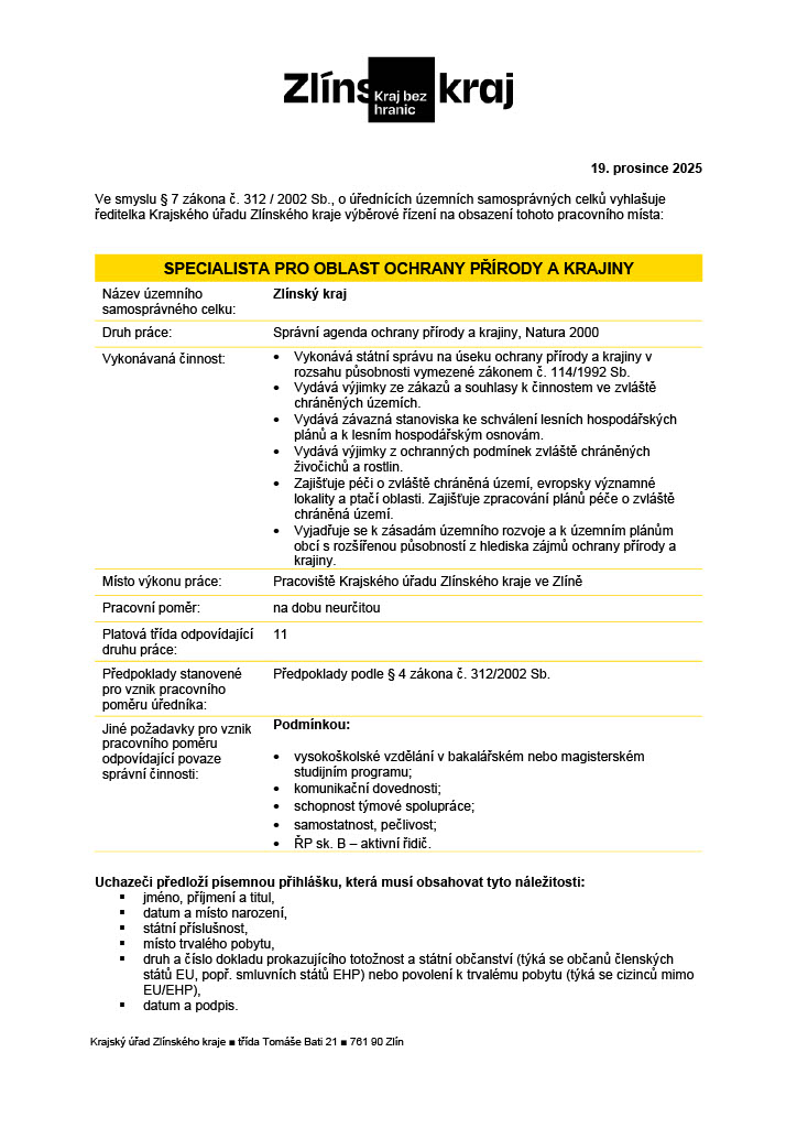 SPECIALISTA PRO OBLAST OCHRANY PŘÍRODY A KRAJINY pro Zlínský kraj